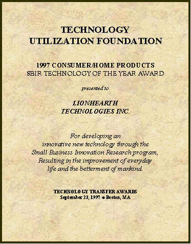Technology Utilization Foundation1977 Award WinnerThe Most InnovativeConsumer/Home ProductAfter two years of development effort, under the guidance of Glenn Steiner, the Virtual Command Post was completed. As a consumer application demonstration, the command post was converted to a vehicle sales showroom. It was demonstrated at the annual Technology Utilization Foundation conference held in Boston, Massachusetts. Against a competition of over 100 other similar Small Business Innovative Research (SBIR) exhibitors, Lionhearth Technology's Virtual Show Room won first place as the most innovative Consumer/Home Product Technology.
