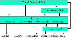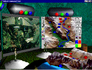 The demonstration Virtual Command Post was constructed using Commercial-Off-The-Shelf (COTS) components. The hardware system was composed of Pentium Pro based computers equipped with high performance 3-D graphics accelerator boards. The software system was developed on top of Microsoft Windows and the Microsoft Direct X library, enabling maximum performance for real time 3-D graphical animation. 3-D Scenes and modeling was implemented with the Microsoft Softimage 3D modeling tools, running on the Windows NT system. (See Figure 4.) The VCP System Concept