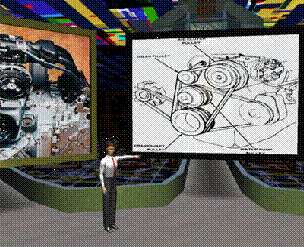 A proposed future version of the system will focus on the following: · Improved component performance (5X) and ease of use · Improved motion capture devices · Improved Demonstration of the VCP Concept- Collaboration, Visualization and Communications · Improved story board and integration with existing C4I structures · Higher resolution graphics display devices SUMMARYEvaluation feedback confirmed the value-added of a VCP environment as an integral part of a multi-modal Human Computer interface environment. Overall, the VCP has been well received. The results of the SBIR effort have demonstrated an effective immersive work environment for performance of collaborative planning and management tasks. Several specific advances were accomplished during this effort as described in the following sections. Demonstration of Virtual ConferencingThis project is probably one of the most significant demonstrations of virtual conferencing to date. Other experiments have demonstrated the idea, but every effort was made to improve production qualities and software stability within the VCP.[3][4][5] The prototype delivered for this project is robust, fully functional and capable of demonstrating the virtual conference concept to its full potential at 100-1,000 times less communications bandwidth than required in earlier demonstrations. Validation of the VCP ConceptThe Phase II prototype provides a platform for validating the effectiveness of the Army’s dispersed command post concept. Commanders are able to interact with the 3D-battlefield model, view satellite weather data on virtual video walls, and collaborate with each other in the virtual command post environment. Through continued testing, the user will be able to compare and evaluate process performance, travel savings, and survivability improvements achievable to current co-located work environments. Low Bandwidth CommunicationsIndependent of the need for a virtual command post, the proposed effort has generated an architecture capable of providing virtual communications for other battlefield tasks. Any soldier currently using radios may find a low-bandwidth, virtual communications capability providing data and multiparty collaboration useful. The audio and communications capabilities necessary for this task have been implemented in this demonstration system. Advanced VR Audio SubsystemThe Army uses hundreds of VR systems in its modernized equipment and training simulators, and has indicated its need for advanced VR-capable audio subsystems. The Audio Subsystem integrated under this effort provides sophisticated set of low-bandwidth digital audio capabilities. These capabilities are available to the Army for its simulator programs. FUTURE ENHANCEMENTSCurrent efforts are continuing in activities designed to improve the utility of the VCP both for Military Command and Control and for commercial applications. One such effort is to develop an HLA based VCP that uses the DoD's new High Level Architecture to control a distributed simulation. A diagram of this proposed system is illustrated in Figure 7 and 8. Additionally, progress is being made in developing commercial variants of the VCP for use in Internet Commerce [6] (Figure 9), distance learning (Figure 10), and tele-medicine. The capabilities of the VCP show that virtual conferencing may be at the forefront of the mobile computing field and should offer a favorable alternative to telecommuting, video-conferencing and other forms of dispersed collaboration. Once a user becomes familiar with the VCP, it becomes self-evident how virtual tele-presence will lead to immersive communication devices that will someday seem as fundamental and ubiquitous as the telephone and television.